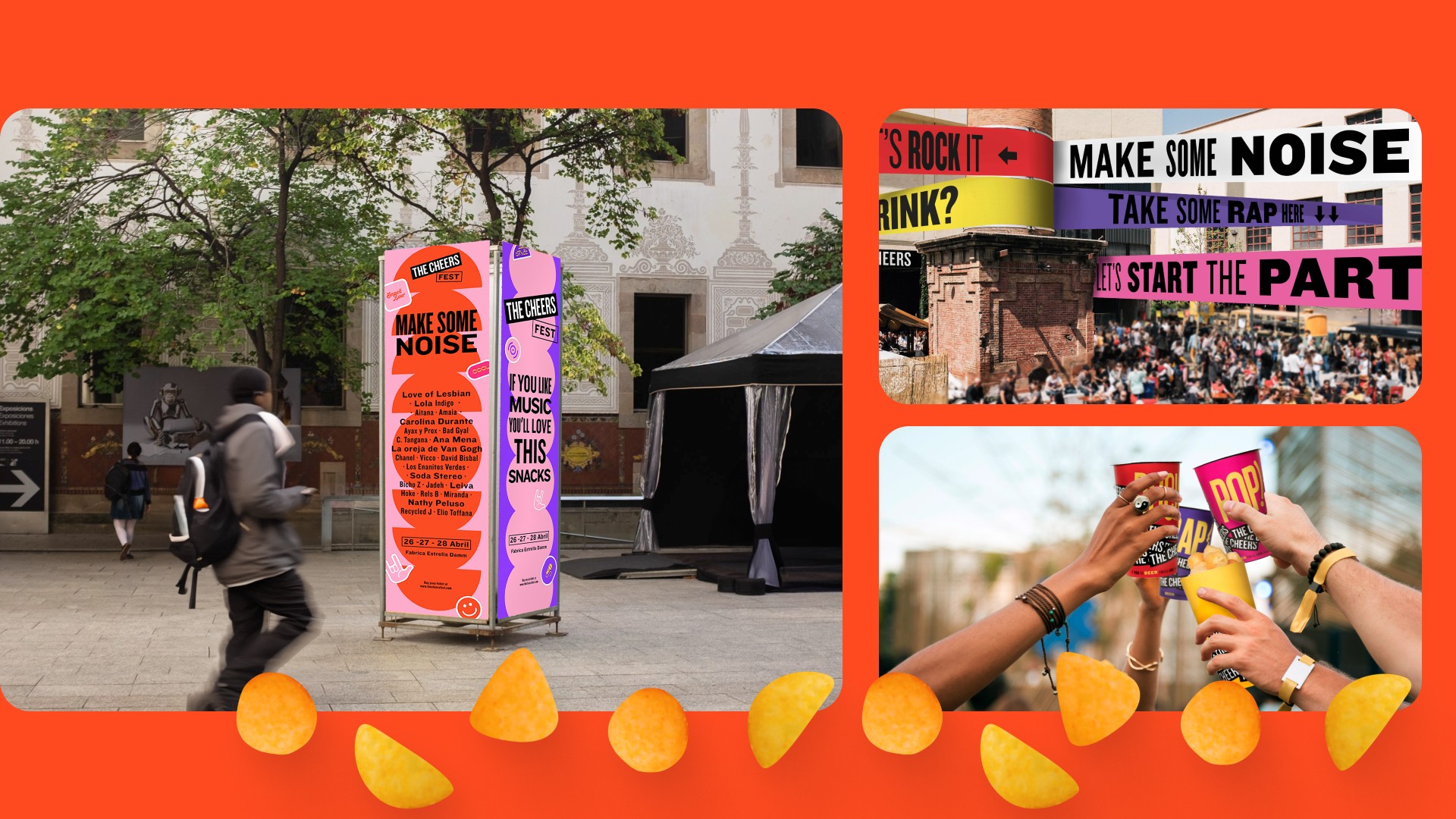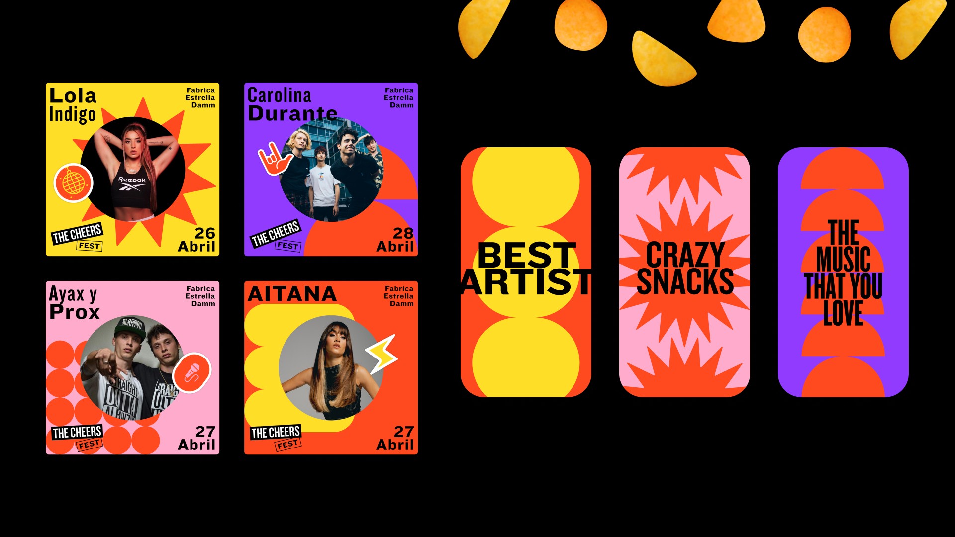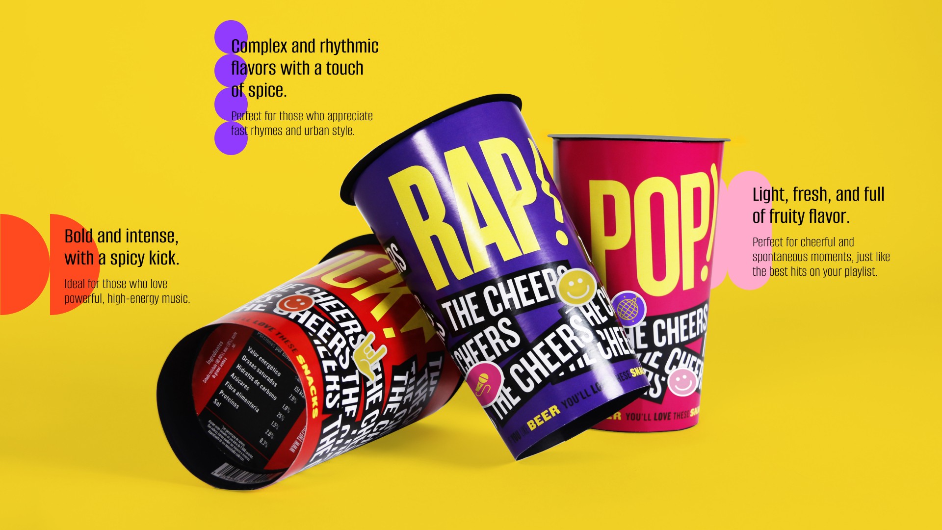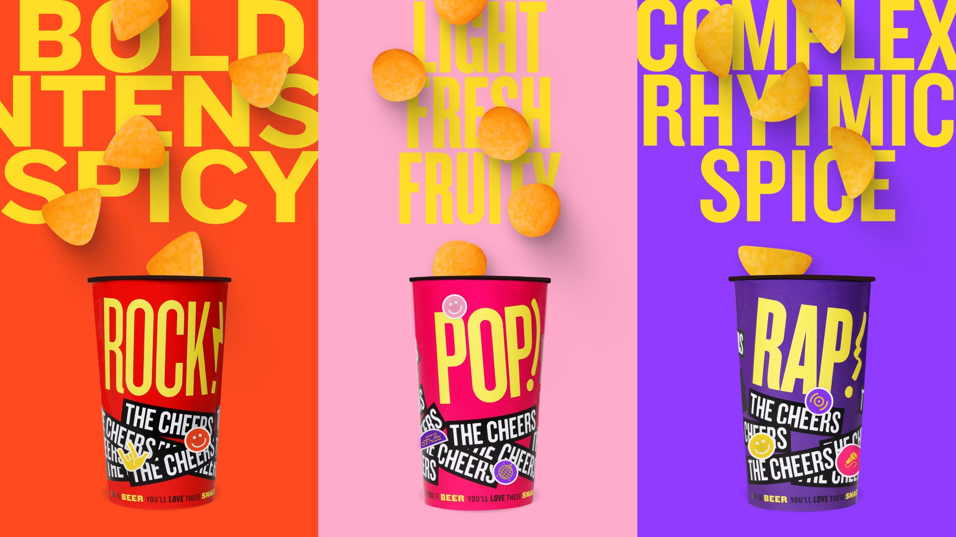 The Cheers is a snack brand that repurposes malt spent grain from beer production to create a delicious, sustainable, and fun snack. It is a brand aimed at a young audience who loves music, enjoys sharing with friends, and cares about the environment.